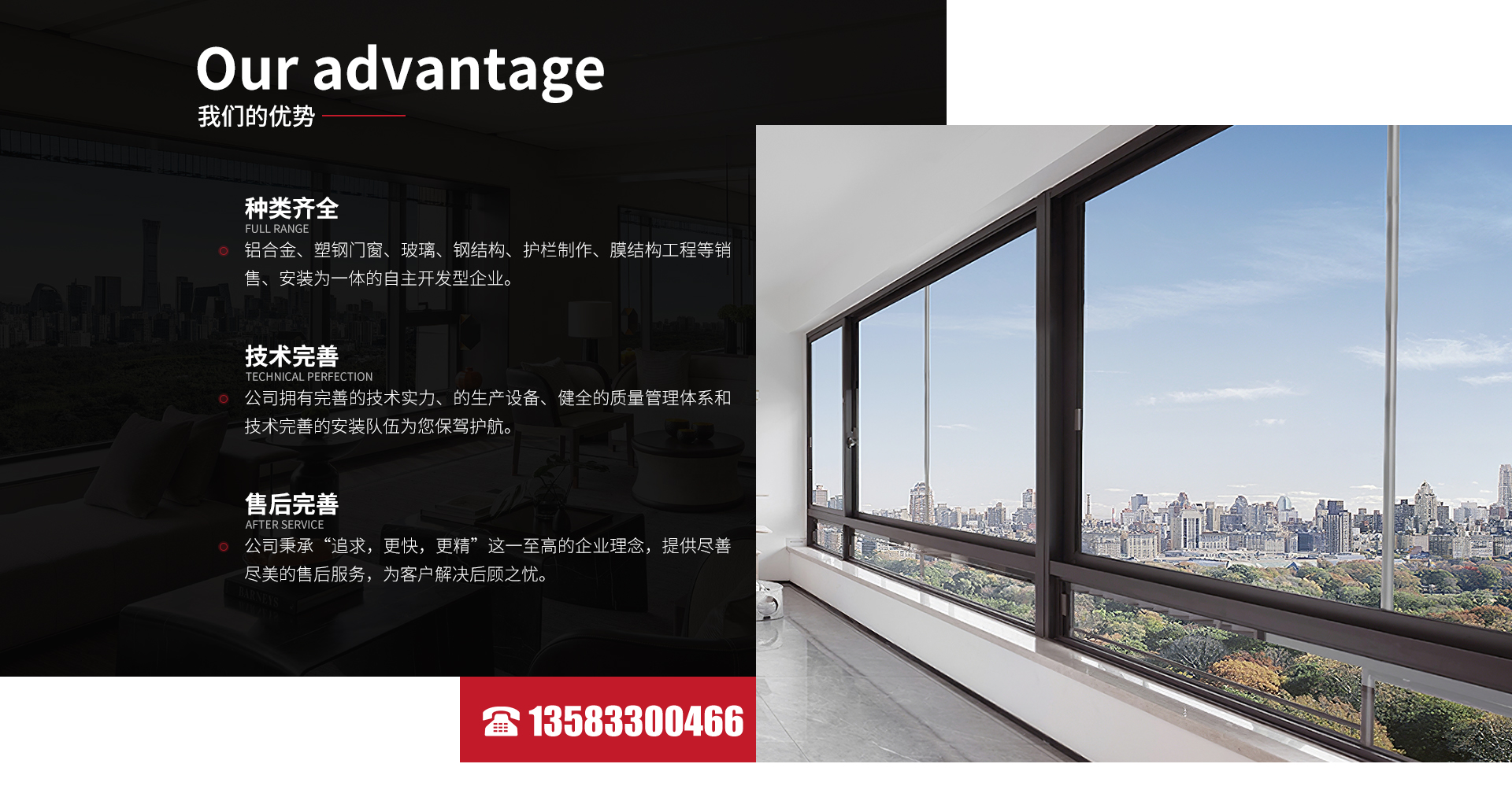 门窗即是建筑的眼睛,我们根据客户与工程的需要对门窗外形和强度进行改进设计,生产不同规格和系列的铝、塑门窗。 我公司秉承着“以质量求规模、以规模求效益”、“让利不让市场”的经营方针,为较大限度地发挥我公司设备技术力量完善、管理手段现代化的优势,在获取经济效益的同时,力求获取更大程度上的社会效益,赢得了广大客户的信赖。
